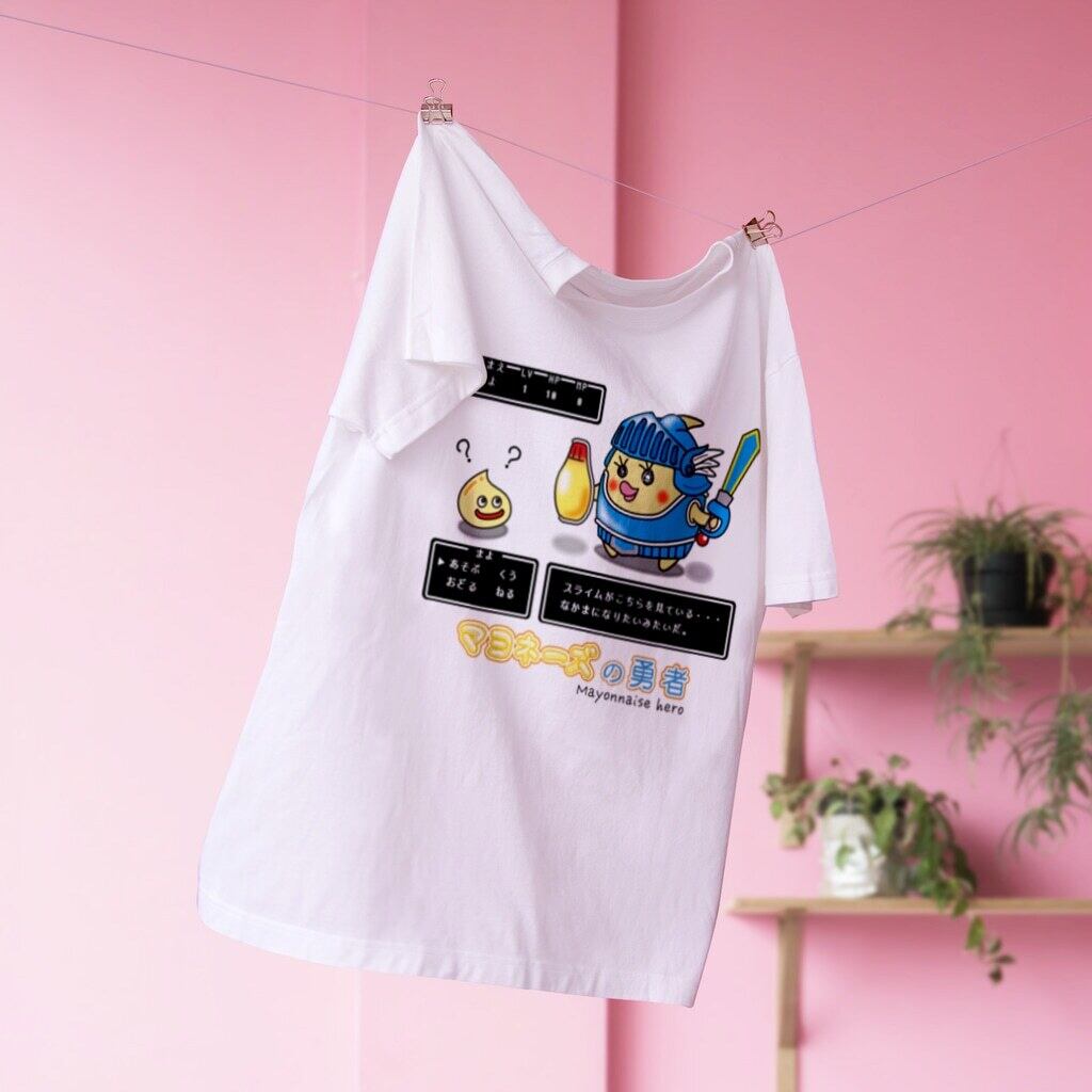 勇者「マヨ」が登場!マヨネーズの妖精「マヨ」とのコラボレーションが実現しました。このスタンダードTシャツは、5.6オンスの丈夫でしっかりとした生地で作られています。クラシックなデザインで、どんなシーンにもマッチします。
