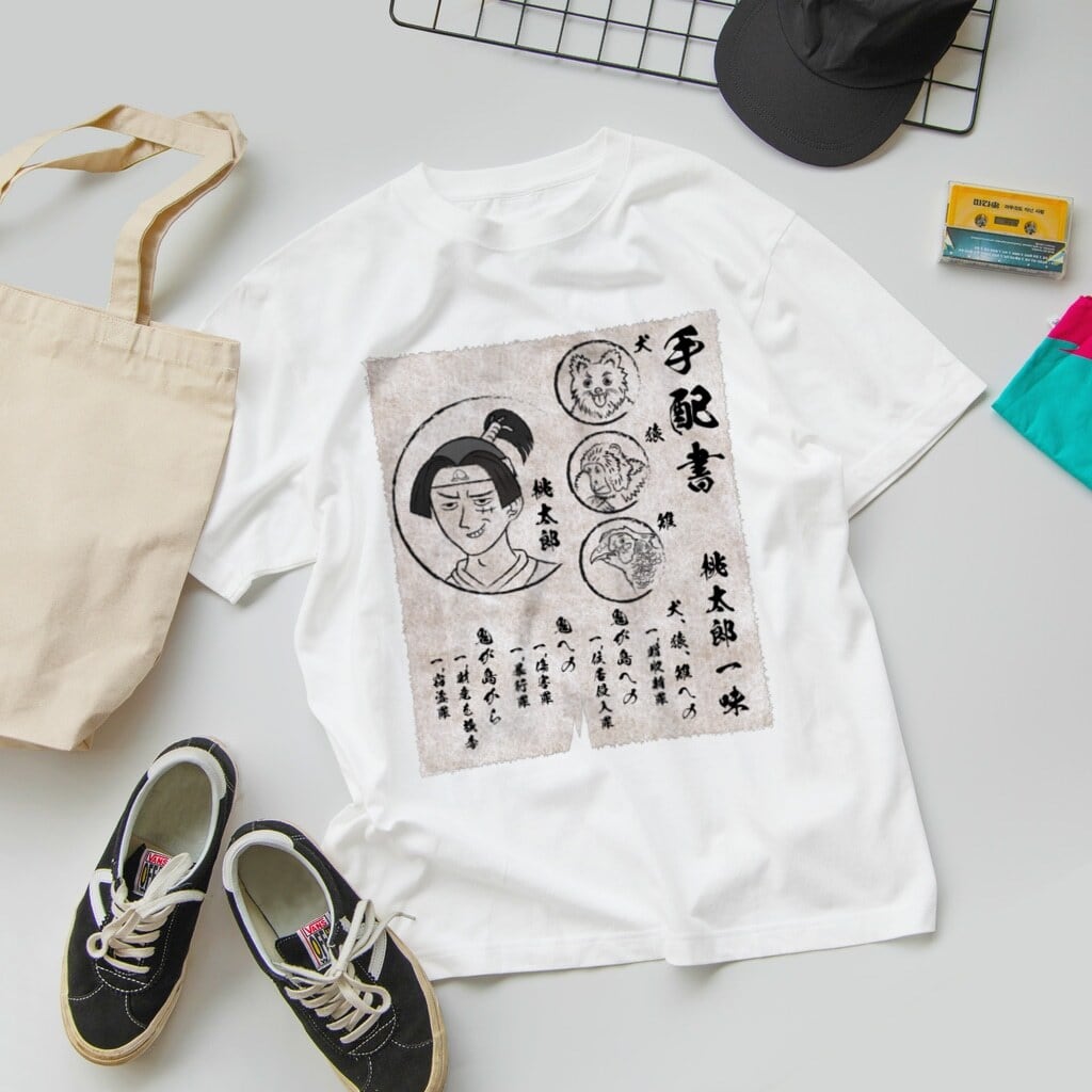 桃太郎一味の仲間たちと一緒に大冒険を始めませんか?あなたの勇気とパワーを引き出す、このTシャツをぜひ手に入れてください!
